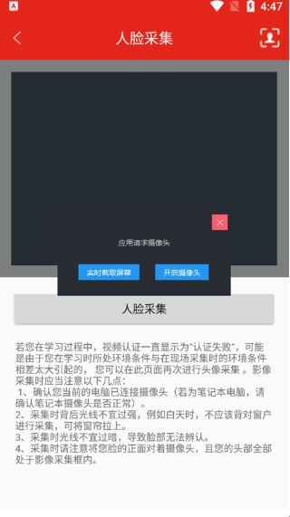 进行头像采集,需要注意的是头像采集时不能背光、头像需清晰。避免进入视频学习时“认证失败”影响学习,头像采集完成后点击进入培训班开始学习。