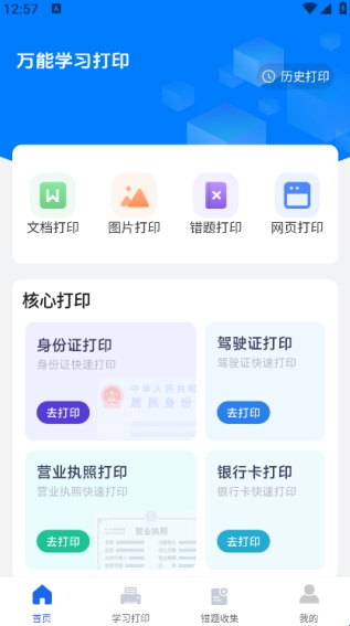 在首页即可看到文档打印、图片打印、错题打印等功能;