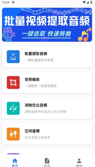 在首页中提供批量提取音频、音频裁剪、消除空白音频以及空间音频和空白音频等功能;