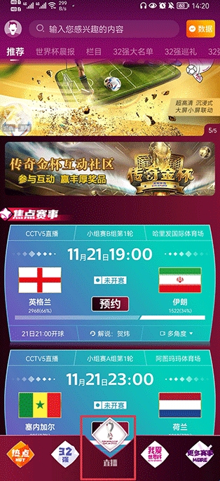 打开卡塔尔世界杯直播App,在首页中点击下方直播