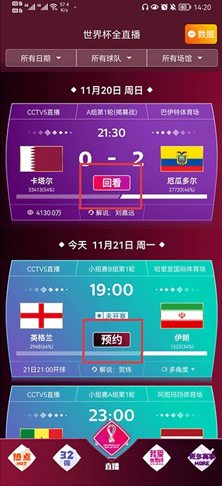 进入后用户可以对已播赛程进行回放观看,或是对即将开始的赛程进行预约