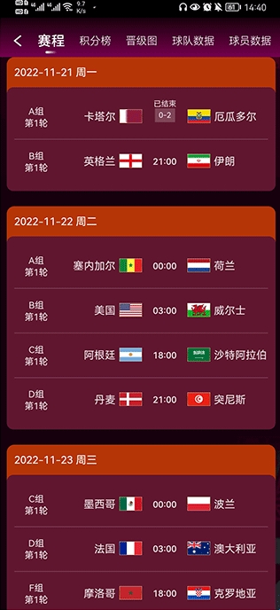 点击右上角数据后,用户可以查询到所有赛程的具体日期,以及球队积分榜、晋级图、球队数据等信息
