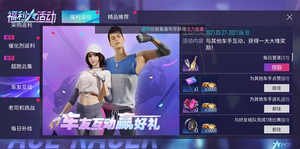 车友互动是一项长期成长任务,其中为其它车友点赞、组队完成比赛、给车友送礼等任务均会奖励大量金币,同时还有轮毂、锦标旗等紫色道具