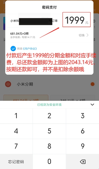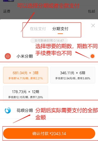 选择分期支付---然后选择小米分期或者花呗分期支付---选择对应分期数---然后点击确认付款即可,部分产品只支持花呗分期或者不支持分期,以商城页面显示为准哦。