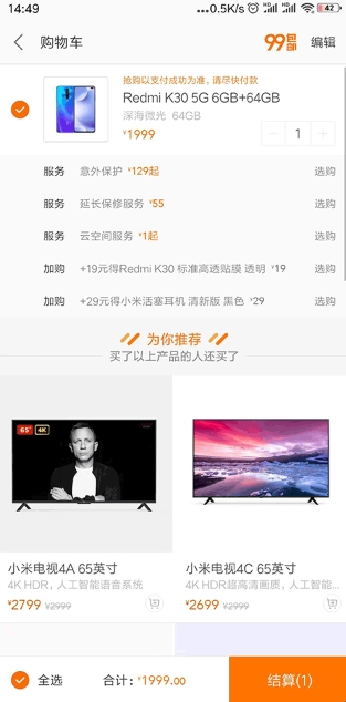 将想要购买的产品加入购物车,以RedmiK30 5G为例,点击结算。