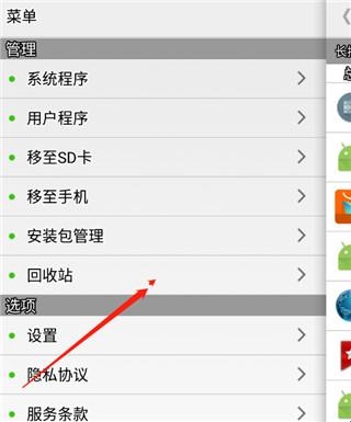 1、打开在本站安装的System app remover,点击左上方显示菜单找到回收站