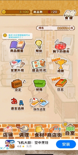 3、街记事是游戏中比较重要的信息,能帮助你了解当前流行食物,提高售卖所得利润,水果店和食店需要你在还完3000000巨款后才可开设。