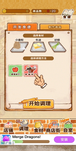 点击盘子,选择所需食材和烹饪方法,再点击“开始调理”就可以成功制作出来啦。