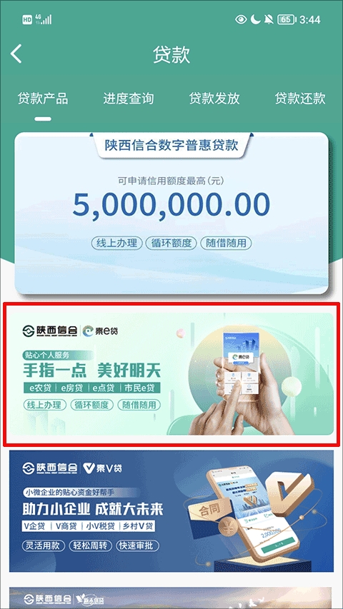 4、接着,在贷款产品当中找到并点击红色方框内的秦E贷;