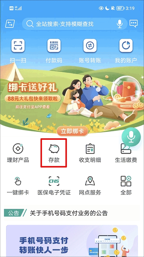 1、首先,打开软件,在首页找到并点击“存款”选项;