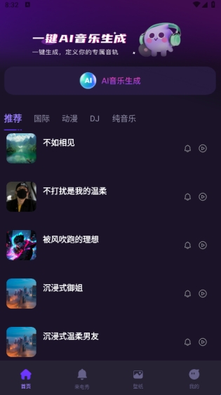 在首页中可以进行一键音乐生成,同时有推荐、国际、动漫、DJ以及纯音乐版块;