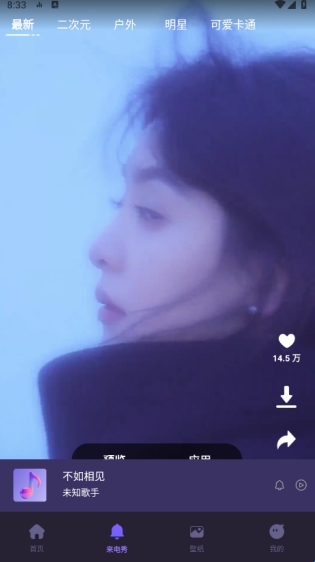 在来电秀中会有最新、二次元、户外、明星以及可爱卡通等类别的来电视频;