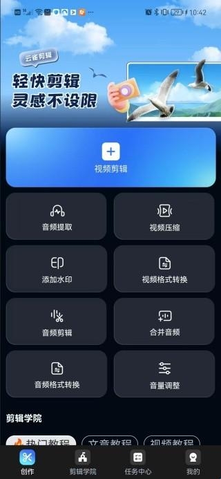 1、在创作页面中有音频提取、视频压缩、添加水印、视频格式转换、视频剪辑等功能;