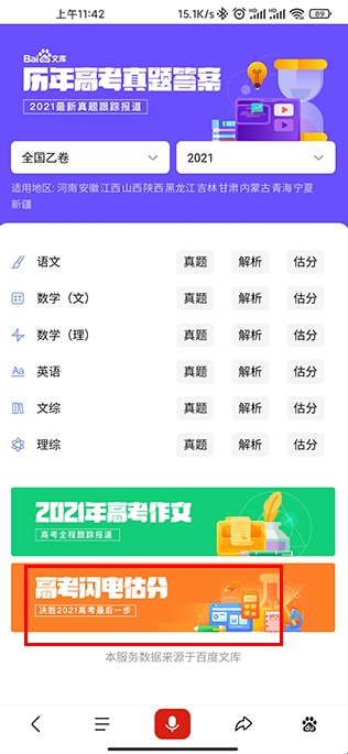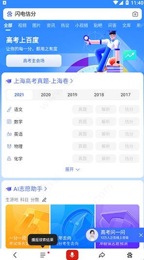 闪电估分系统是基于百度文库基础而深度开发,官方将文库中更新的全国各地高考真题进行筛选,让学生通过百度觅题APP,找到自己对应省份的考题试题,通过手机端进行成绩估分。