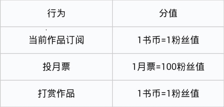 通过当前作品订阅、投月票和打赏作品的行为,可以获得粉丝值,对应的分值兑换情况如图所示