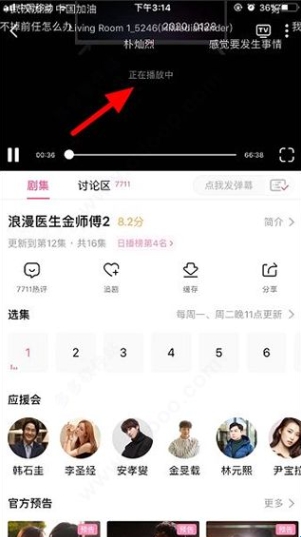 5、提示“正在播放中”,就说明韩小圈中的视频内容就已经成功投屏到电视上了,投屏时还可以在手机上看弹幕。