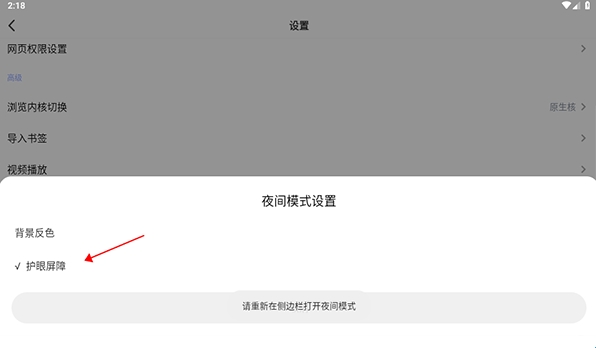 3、我们需要在设置中点击夜间模式设置,点击右侧的背景反色功能;