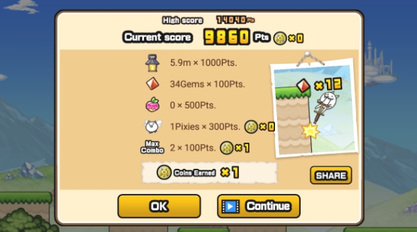 2、【超快乐的道具收集】游戏画面会出现猫咪妖精,带上妖精的话,就能让猫咪进行连续跳跃,不过连续跳跃后猫咪妖精就会消失,要谨慎使用哦