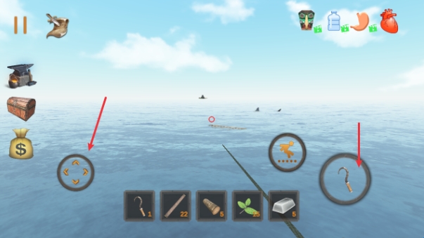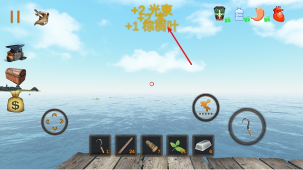 使用钩子钩住资源:木板、碎片、树叶、木桶等等。它们会帮助你生存!