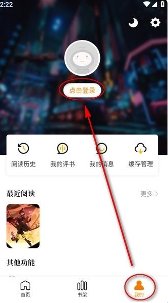 打开酷漫熊后,点击右下角“我的”,然后点击上方的“点击登录”;