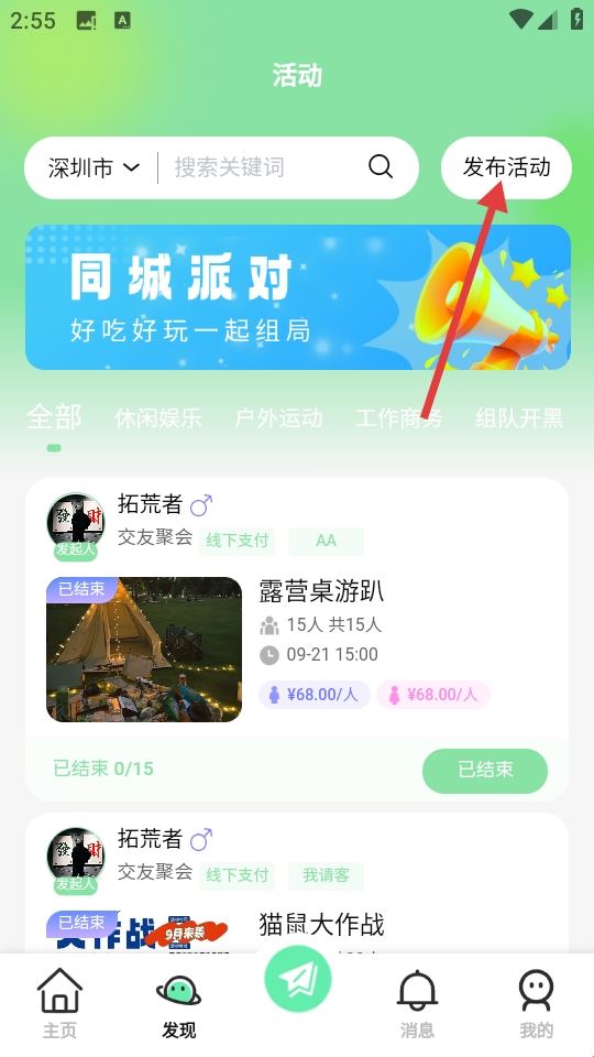3、在【发现】页面,点击【发布活动】,进入发布活动界面。