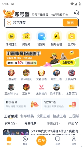 账号蟹是一款以游戏账号租借和买卖为内容的游戏交易平台。在这里,任何游戏的账号都有人进行买卖,而且用户想要出售账号时,会进行一系列的认证,和严格的后台审核机制,所以平台会保证交易的公平性,不用担心骗钱的情况,有需要交易游戏账号的朋友,欢迎下载体验。