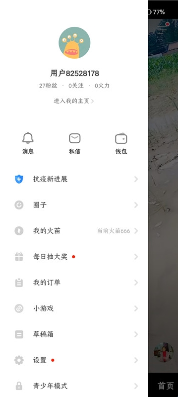 抽奖完毕以后,我们回到视频首页,点击页面右上角的【火苗】按钮,来到提现页面。