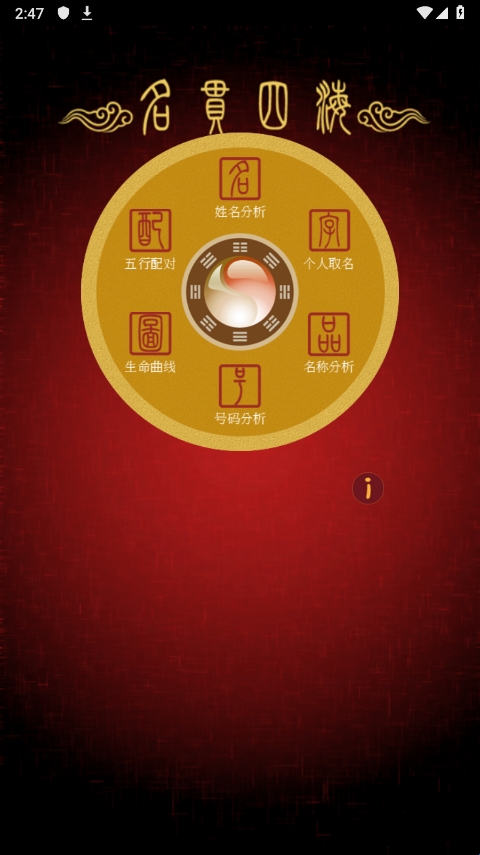1、在本站免费下载安装该软件的官方版,打开进入,这里的八卦阵铜钱上有六个功能分别是姓名分析、个人取名、名称分析、号码分析、生命曲线和五行配对。