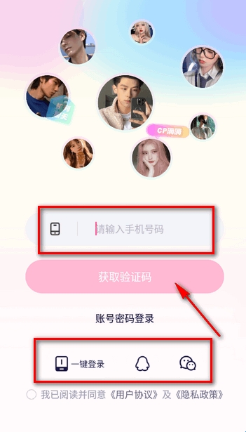 3、输入手机号码,获取验证码就可以注册登录,也可使用qq、微信一键登录。