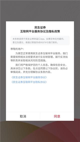 1、在本站免费下载民生证券手机版,打开后选择同意条款即可;