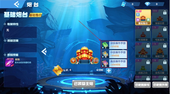 3、玩家可以对已拥有的炮塔进行升级强化,一个有初级、中级、高级三种经验手册可以使用。