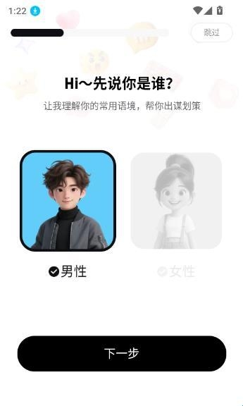 3、然后对自己的个人角色进行设置,点击右上角的“跳过”按钮来进行下一步。