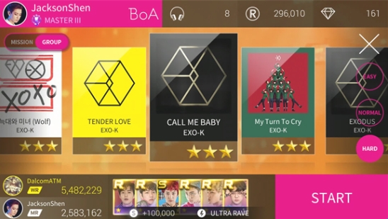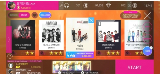 6、superstar smtown游戏有两个模式,普通的关卡Weekly和每天随机打一首歌的Superstar模式,这两个都有刷榜奖励。Weekly的榜单按所有歌手中每个歌手分数最高的五首歌的分数总和排名,达到一定的名次可以提升等级,获得奖励和金币加成。