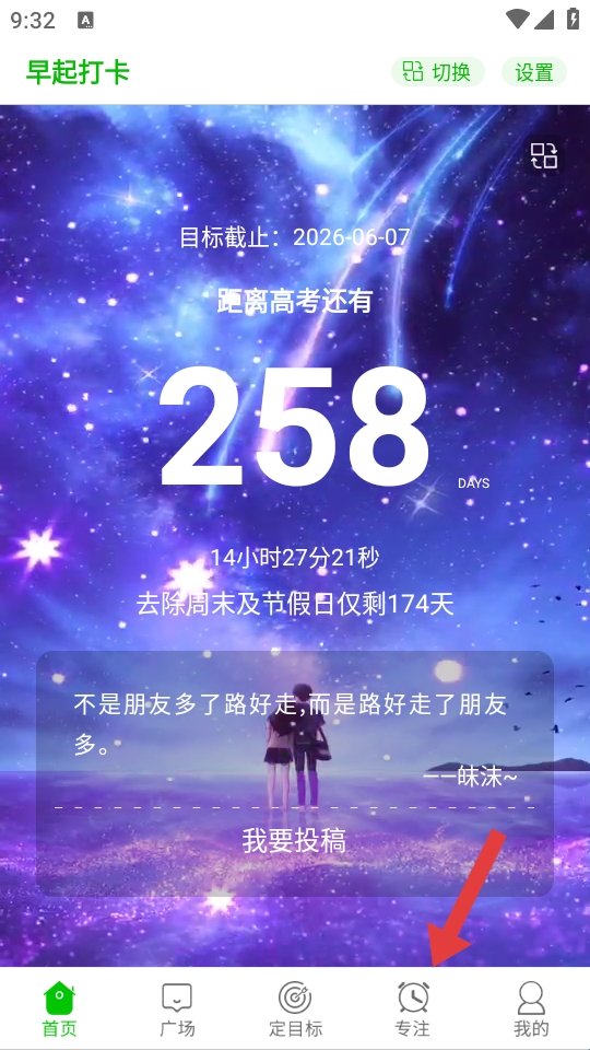 高中高考倒计时是一款专门为即将参加高考的学子们所打造的学习软件软件能够帮助用学生记录自己的学习内容,同时能够使用不同的功能去辅助用户进行一个学习,激发用户学习的动力,让用户明白拼搏的道理,让我们的高三生活不再迷茫,有需要的朋友一起来下载吧!