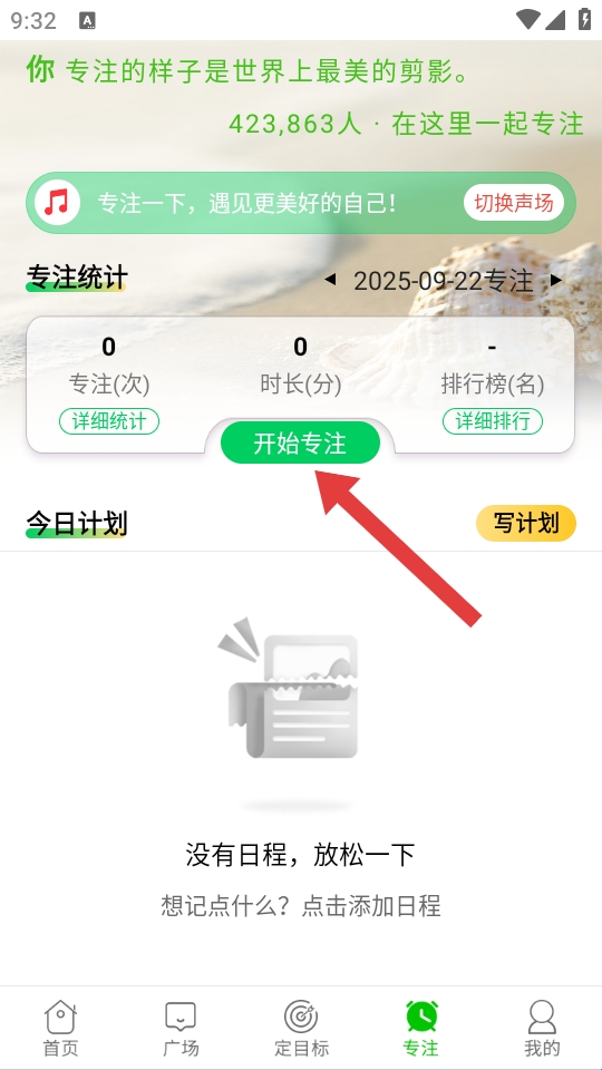 1、在首页点击专注,进入专注功能页面,可查看专注统计等信息。