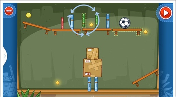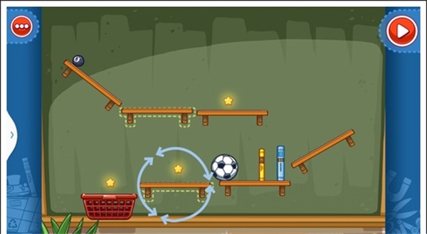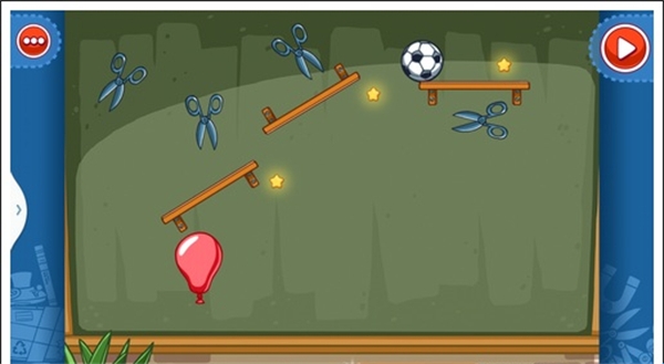 我们只需要将两个木板凳放在斜放在两侧,气球放在足球下面,这样使气球飞上去,碰到足球这样就能获得星星。