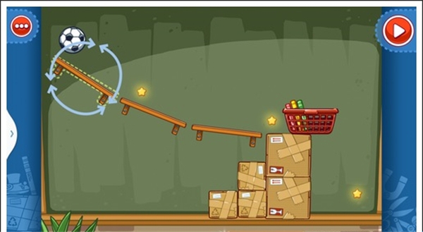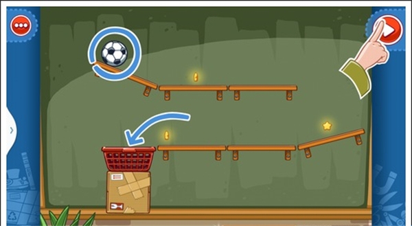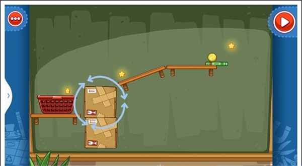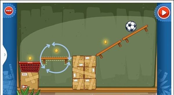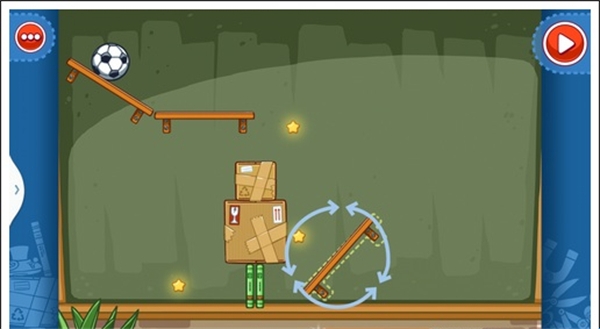 我们只需要将两个木箱重叠放在中间空白处,就可以让球飞过去,获得星星。