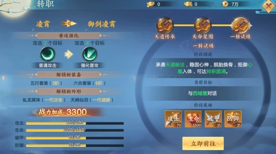 凌霄达到140级后,便会开启一转任务。一转任务总共有3个阶段,需达到对应等级方可开启,根据任务提示完成3阶段的任务后,可成功转职。