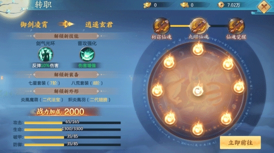二转后将成为逍遥玄君,解锁新技能;解锁7阶/8阶装备,开放二代翅膀、法宝外形,同时为上仙增加大量战力