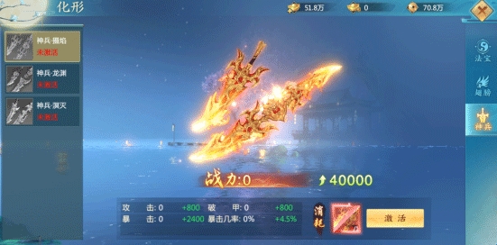 海量暴击属性;激活神兵外形可以按百分比提升暴击属性,并获得专有的外形显示。