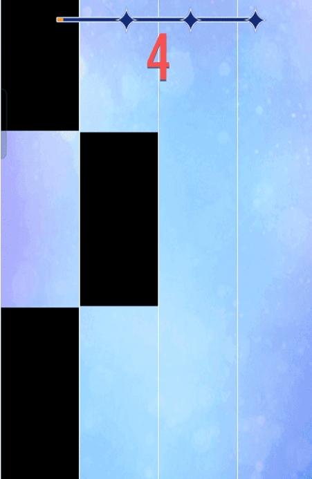 4、进入游戏后,界面会出现四个赛道,每个赛道会随歌曲的乐谱出现黑色的钢琴键,从上向下移动,点击黑色的钢琴键就会发出音符的声音,连续点击成功,音乐就会流畅的播放出来;
