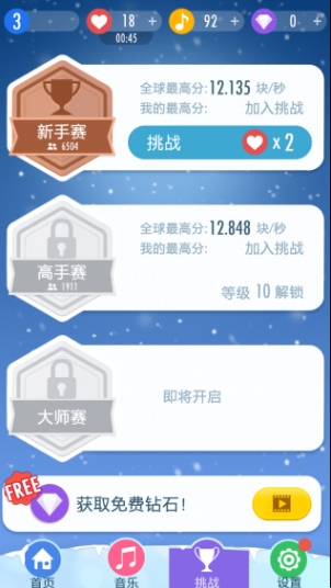 相比前作而言,本作增加了更多的玩家互动环节,我们可以通过升级来解锁新手、高手、大师等赛事,不同的赛事所需要的反应能力也不同,并且这些赛事都不是挑战某一个定速的歌曲,而是挑战玩家的手速,玩家的手速有多快,黑键就会出现多快,所以各位菜鸟想要变为手速达人,这可是一个不错的选择。