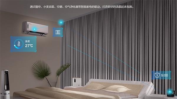 通过窗帘、小美音箱、空调、空气净化器等智能家电的联动,打造舒适的清晨起床氛围。