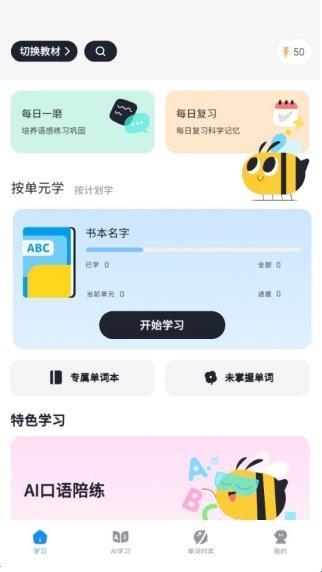4、从单词学习、复习到口语陪练,覆盖英语学习的多个方面,还有专属单词本和未掌握单词板块。