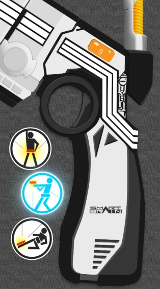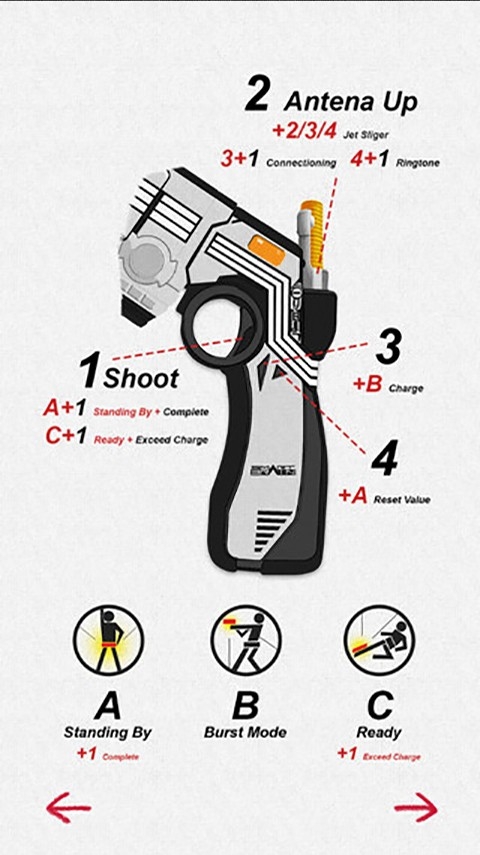 这个骑士是用腰带枪变身的,首先点击第一个按钮,组装手枪,点击第二个按钮进入变身的白热化阶段,这时扣动扳机。