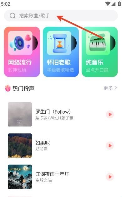 2、可以直接在搜索栏搜索自己喜欢的歌曲或者歌手