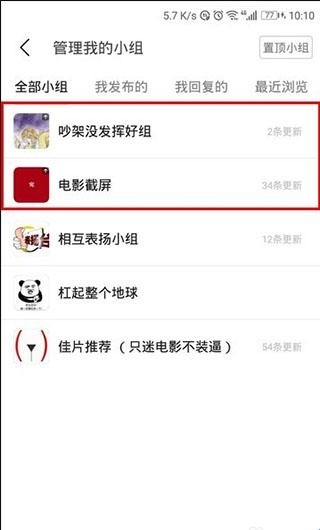 3、打开管理我的小组页面之后,点击右上角的“置顶小组”;