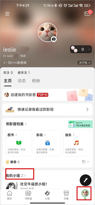 1、登录手机豆瓣,进入“我”,点击“我的小组”。