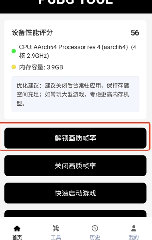 1、在本站下载完软件后,打开进入到主界面点击解锁画质帧率。