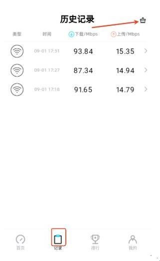 4、点击记录可以看到自己的测试记录。不需要的话也可以点击右上角刷子删掉历史记录。